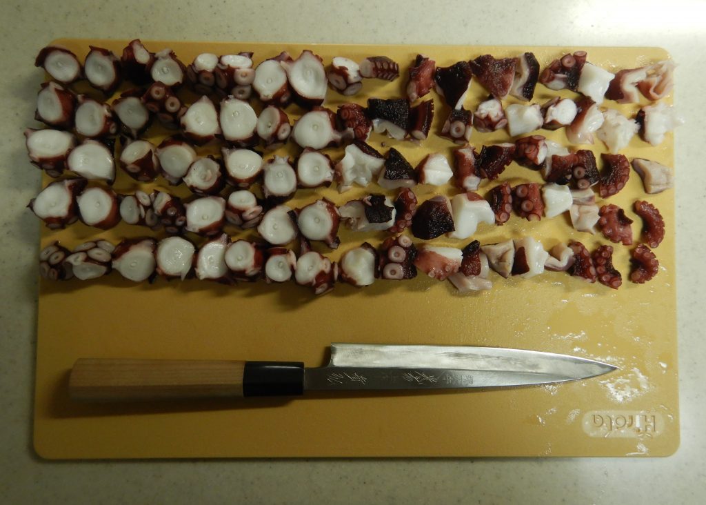 今日は北海道産のタコ、大きめにカット、20個分で約400円。