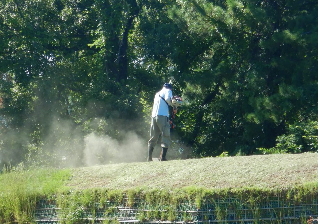 キャンプ場の周辺で草刈りをしているスタッフは、